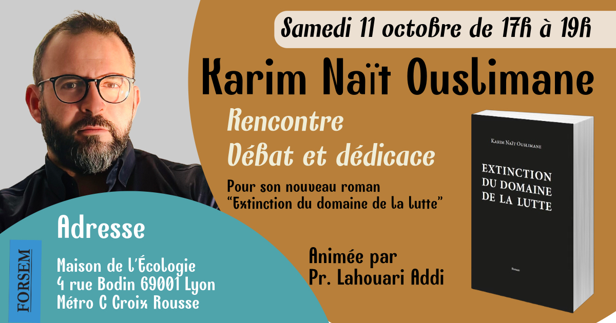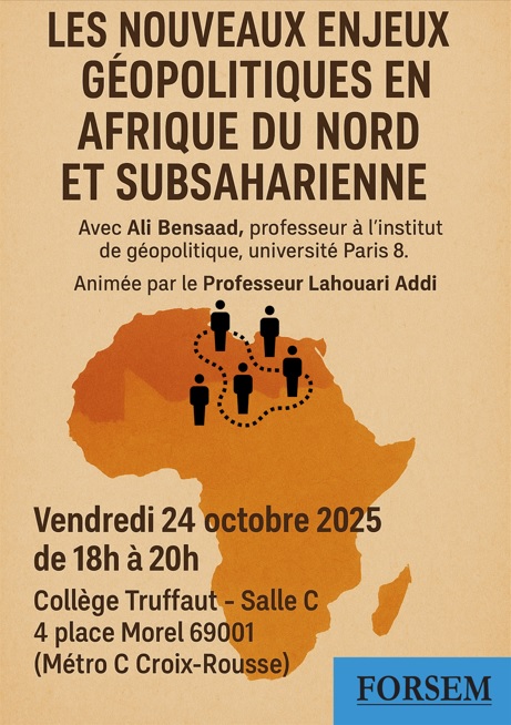 Le vendredi 24 octobre 2025 de 18h à 20h Les nouveaux enjeux géopolitiques en Afrique du Nord et subsahariens Avec Ali Bensaad, professeur à l’institut de géopolitique, université Paris 8. . Animée par le PR. Lahouari Addi Collège Truffaut - Salle C 4 place Morel 69001 rencontre-débat Le samedi 11 octobre 2025 de 17h à 19h Extinction du domaine de lutte Avec Karim Nait Ouslimane, Pour son nouveau roman "Extinction du domaine de lutte" (ed. Fables Fertiles, 21 août 2025). Animée par le PR. Lahouari Addi Maison de l'Ecologie 4, rue Bodin 69001 Lyon (Métro C Croix-Rousse) Le samedi 14 juin 2025 de 18h à 20h Règlements de comptes au coeur du pouvoir algérien Avec Farid ALILAT,Journaliste, auteur et spécialiste de l'Algérie. Il a publié récemment aux Editions Plon, Un crime d'Etat, 2024 Maison de l'Ecologie 4, rue Bodin 69001 Lyon (Métro C Croix-Rousse) conférence-débat Le jeudi 15 mai 2025 de 19h à 21h Réformer l'islam pour sortir de l'islamisme Avec Razika Adnani est Écrivaine franco algérienne, philosophe et islamologue. Maison de l'Ecologie 4, rue Bodin 69001 Lyon (Métro C Croix-Rousse) Conférence-débat Le mercredi 16 avril 2025 de 18h à 20h La question berbère en Algérie : rupture et continuité Avec Ali GUENOUN, docteur en histoire de l'université de Paris I Panthéon-Sorbonne. Ses travaux portent sur l'histoire de l'Algérie contemporaine. Il a notamment publié "Chronologie du mouvement berbère. Un combat et des hommes" (Alger, éditions Casbah) et "La question kabyle dans le nationalisme algérien 1949-1962" (Paris, Éditions du Croquant, 2021). Université Lumière Lyon 2 - Batiment Athéna - Salle 051 7, rue Chevreuil 69007 Lyon (Tramway 1, station Quai Claude Bernard) Le vendredi 26 février 2025 de 18h à 20h La Syrie après Assad Avec Samir Aïta, Président du Cercle des Économistes Arabes, Membre du Forum Démocratique Syrien. Sciences Po Lyon - Amphi Marcel Pacaut 4 rue du Professeur Appleton – Lyon 7 (Tram T2 – station Centre Berthelot) Le vendredi 14 février 2025 de 18h à 20h S'engager sur les réseaux sociaux numériques : quels enjeux pour les mobilisations sociales en Algérie? Avec Fetta Belgacem, Docteure en sciences de l'information et de la communication et chercheuse associée à l'IMSIC (Aix-Marseille Université). Elle mène des recherches en lien avec les médias traditionnels, les médias numériques, l'espace public et les mobilisations sociales. auteure du livre Mobilisations sociales à l'épreuve du numérique, Edition L'harmattan 2024. Maison de l'Ecologie 4, rue Bodin 69001 Lyon (Métro C Croix-Rousse) Le samedi 25 janvier 2025 de 16h00 à 18h00 Maroc, la stabilité à quel prix ? Avec Fouad ABDELMOUMNI, Militant des droits de l’homme, coordinateur national de l'Instance Marocaine de Soutien aux Détenus Politiques - HIMAM, membre de conseils consultatifs pour l’AMDH et Human Rights Watch et économiste marocai Maison de l'Ecologie 4, rue Bodin 69001 Lyon (Métro C Croix-Rousse) Le samedi 7 décembre 2024 de 16h00 à 18h00 chemin de vie : colonisation, libération nationale et luttes pour la démocratie Avec Madjid BENCHIKH, Ancien doyen de la Faculté de droit et des sciences économiques de l’université d’Alger, Professeur émérite à la Faculté de droit de Cergy-Pontoise et professeur invité de plusieurs universités étrangères. Maison de l'Ecologie 4, rue Bodin 69001 Lyon (Métro C Croix-Rousse) Le vendredi 8 novembre 2024 de 18h à 20h00 Pierre Bourdieu et la kabylie Avec Tassadit Yacine, Anthropologue, directeure d'Etudes à l'EHESS et chercheuse au LAS (collège de France), spécialiste de la culture berbère. Salle du conseil - Mairie du 1er arrondissement de Lyon 2 place Sathonay 69001 Lyon Le mercredi 16 octobre 2024 de 17h30 à 19h30 L'art de la paix dans un contexte surconflictualisé Avec Bertrand Badie, professeur émérite à Sciences Po Paris. Sciences Po Lyon - Amphi Marcel Pacaut 4, rue du professeure Appleton Lyon 7ème (Tram T2, Station SciencesPo Centre Berthelot) Le lundi 7 octobre 2024 de 18h à 20h00 Le poids diplomatique de l'Arabie Saoudite dans la géopolitique régionale Avec Lahouari Addi Sociologue et politologue, professeur émérite à Sciences Po Lyon. Maison des Sciences de l’Homme - Salle Marc Bloch 14 Av. Berthelot, 69007 Lyon, (Métro jean Macé, Tram T2 centre Berthelot) Rencontre-débat Le jeudi 25 avril 2024 de 19h à 21h Populations du Nord-Mali, entre conflits armés et impasse politique Avec Abdoulahi ATTAYOUB, Consultant, Président de l’Organisation de la Diaspora touarègue en Europe (ODTE) Et Charles GREMONT, Historien, chercheur à l'IRD (laboratoires : LPED à Marseille et Macoter à Bamako). Maison de l'écologie 4, rue Bodin 69001 Le vendredi 12 avril 2024 de 20h à 21h30 Algérie, le Hirak : 4 ans après. Avec Lahouari Addi Sociologue et politologue, professeur émérite à Sciences Po Lyon. Et Tahar Khalfoune, juriste Maison de l'écologie 4, rue Bodin 69001 Rencontre-débat Le mardi 9 avril 2024 de 18h à 20h Le Maroc dans le monde: entre vision impériale et vision stato-nationale Avec Mohammed Tozy, Professeur de science politique aux Universités Hassan II (Casablanca, Maroc) et d'Aix-en-Provence (France) Et Béatrice Hibou, Directrice de recherches au CNRS (rattachée au Centre d'études et de recherches internationales – Sciences Po CERI) Maison des Sciences de l’Homme 14 Av. Berthelot, 69007 Lyon, (Métro jean Macé, Tram T2 centre Berthelot) Le jeudi 7 mars 2024 de 18h30 à 20h30 La guerre à Gaza, un tournant dans l'histoire du conflit Israël-Palestine Jean-Paul Chagnollaud, Professeur émérite des Universités, Président de l’iReMMO, directeur de la revue Confluences Méditerranée. Il est auteur de nombreux ouvrages et articles sur les relations internationales, la Méditerranée et le Moyen-Orient. Maison de l'écologie 4, rue Bodin 69001 Rencontre-débat Le jeudi 1 février 2024 de 18h00 à 20h00 La transition inachevée e