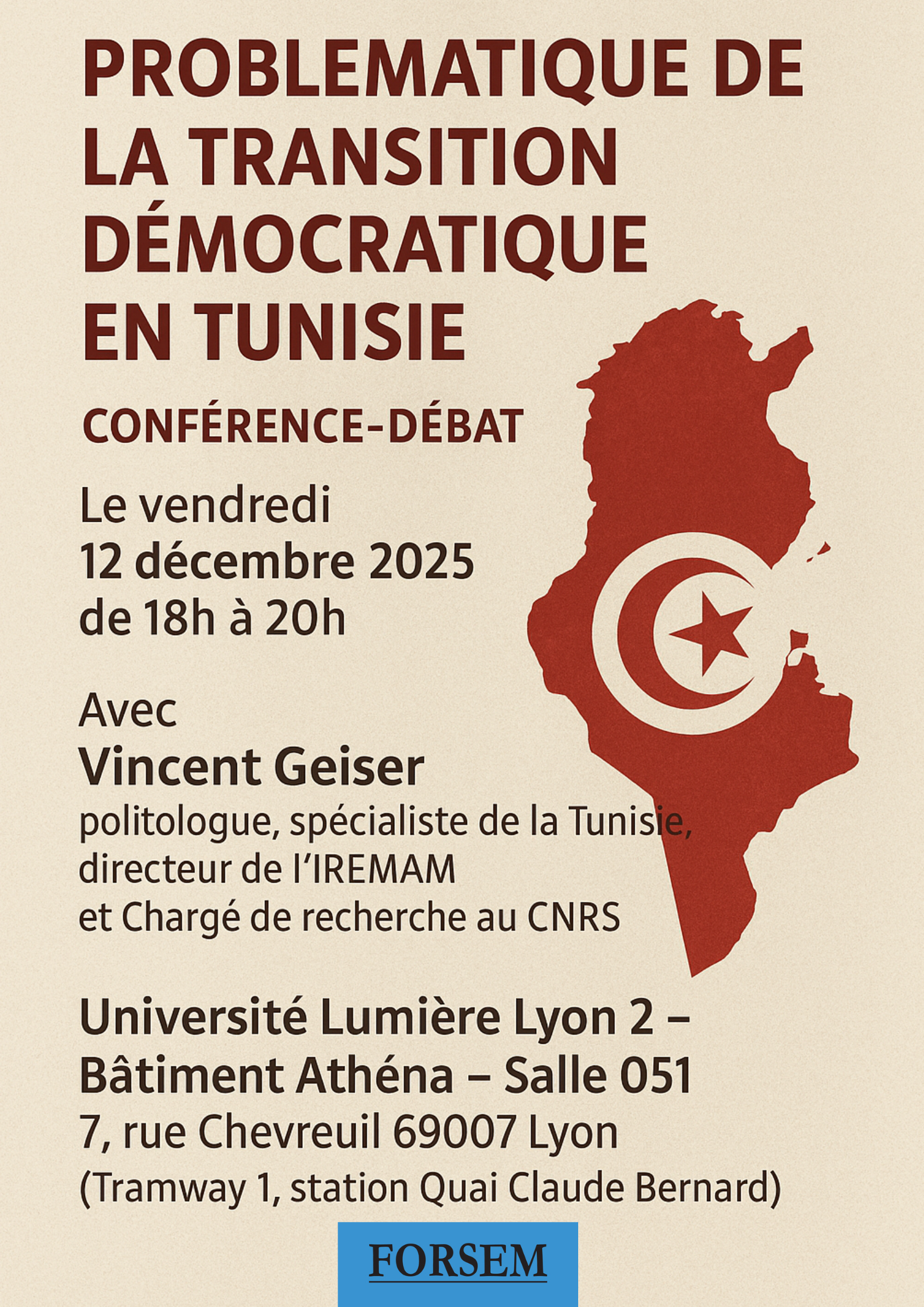 Le vendredi 24 octobre 2025 de 18h à 20h Les nouveaux enjeux géopolitiques en Afrique du Nord et subsahariens Avec Ali Bensaad, professeur à l’institut de géopolitique, université Paris 8. . Animée par le PR. Lahouari Addi Collège Truffaut - Salle C 4 Pl. du Lieutenant Morel, 69001 Lyon rencontre-débat Le samedi 11 octobre 2025 de 17h à 19h Extinction du domaine de lutte Avec Karim Nait Ouslimane, Pour son nouveau roman "Extinction du domaine de lutte" (ed. Fables Fertiles, 21 août 2025). Animée par le PR. Lahouari Addi Maison de l'Ecologie 4, rue Bodin 69001 Lyon (Métro C Croix-Rousse) Pour être tenu informer de nos activés, inscrivez vous en envoyant un mail à l'adresse suivante :contact@forsem.fr |