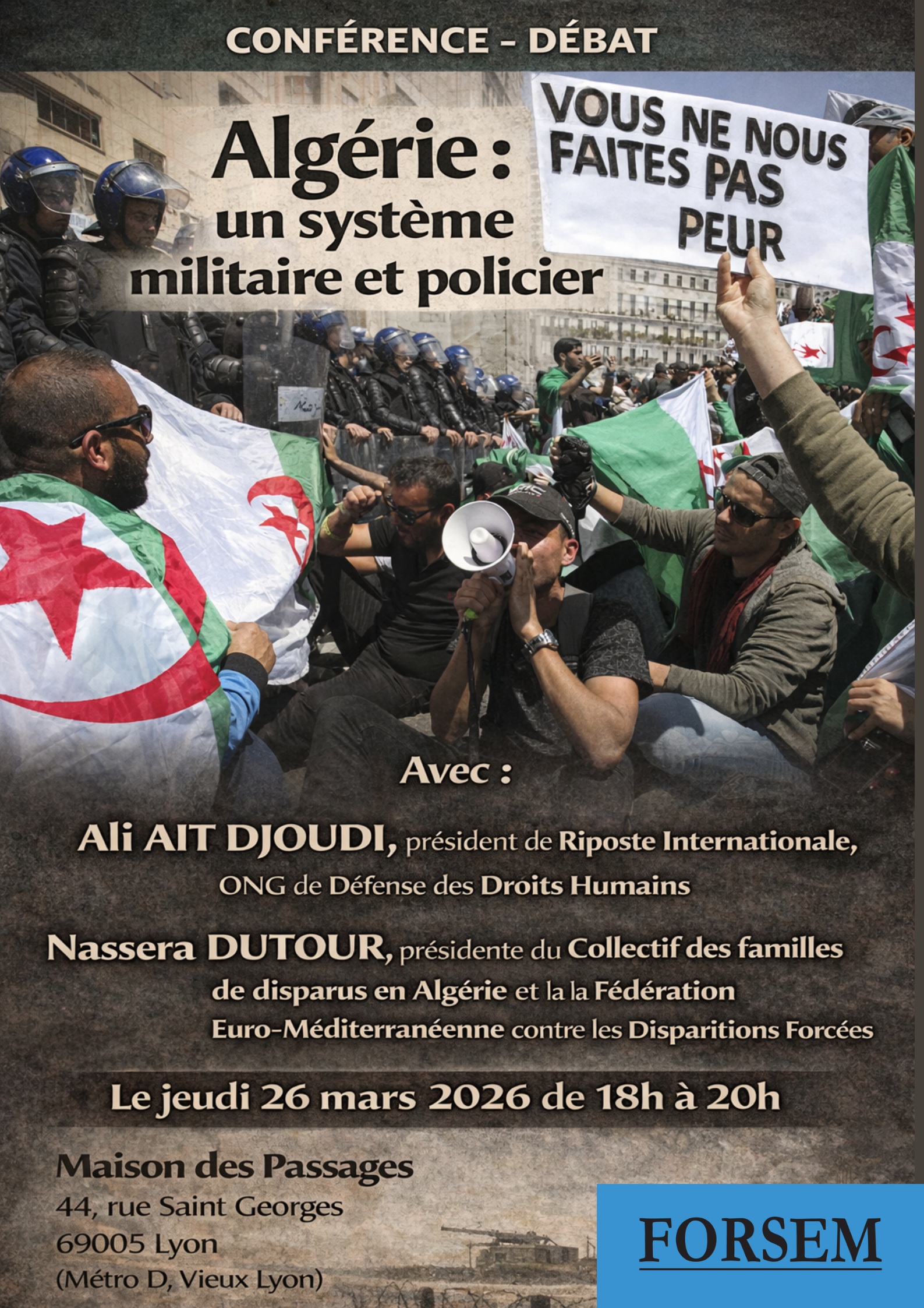 Le jeudi 26 mars 2026 de 18h à 20h Algérie, un système miltaire et policier Avec Ali AIT DJOUDI, président de Riposte Internationale, ONG de Défense des Droits Humains Nassera DUTOUR, présidente du Collectif des familles de disparus en Algérie et de la Fédération Euro-Méditerranéenne contre les Disparitions Forcées Maison des Passages 44, rue Saint Georges 69005 Lyon (Métro D, Vieux Lyon) Conférence-débat Le mardi 25 février 2026 de 18h à 20h Tunisie : Les juifs, nos frères en la patrie Avec Habib KAZDAGHLI, universitaire tunisien, présentation de son livre "les juifs, nos fréres en la patrie Espace BANCEL 50, rue Bancel 69007 Lyon 7 (Tramway 2, station centre Berthelot) Pour être tenu informer de nos activés, inscrivez vous en envoyant un mail à l'adresse suivante :contact@forsem.fr |